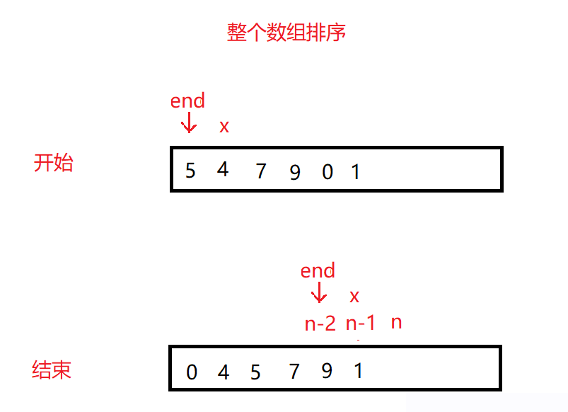 我们一开始并不知道数组是不是有序的,所以我们控制下标,end从0开始,将end+1位置的值始终保存到x中,循环进行单趟排序即可,最后结束时end=n-2,n-1位置的数字保存到x中