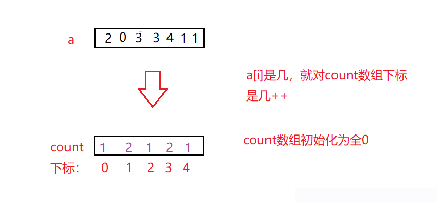 对于给定的任意数组a,我们需要开辟一个计数数组count,a[i]是几,就对count数组下标是几++