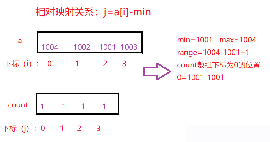 这里我们用到了绝对映射,即a[i]中的数组元素是几,我们就在count数组下标是几的位置++,但是对于数据比较聚集,不是从较小的数字开始,例如1001,1002,1003,1004这样的数据,我们就可以用到相对映射的方法,以免开辟数组空间的浪费,count数组的空间大小我们可以用a数组中最大值减去最小值+1来确定(即:range=max-min+1),我们可以得到count数组下标 j =a[i]-min