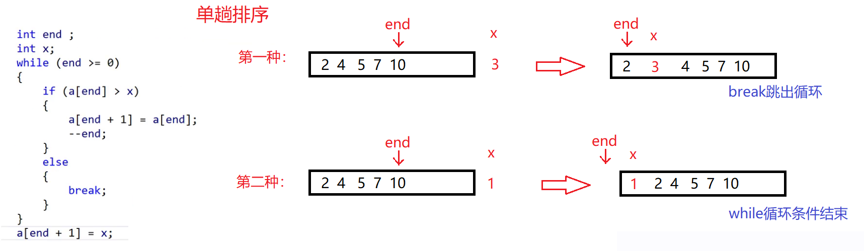 (1)待插入的数字是在前面有序数字的中间数,直接比较将x赋值给end+1位置