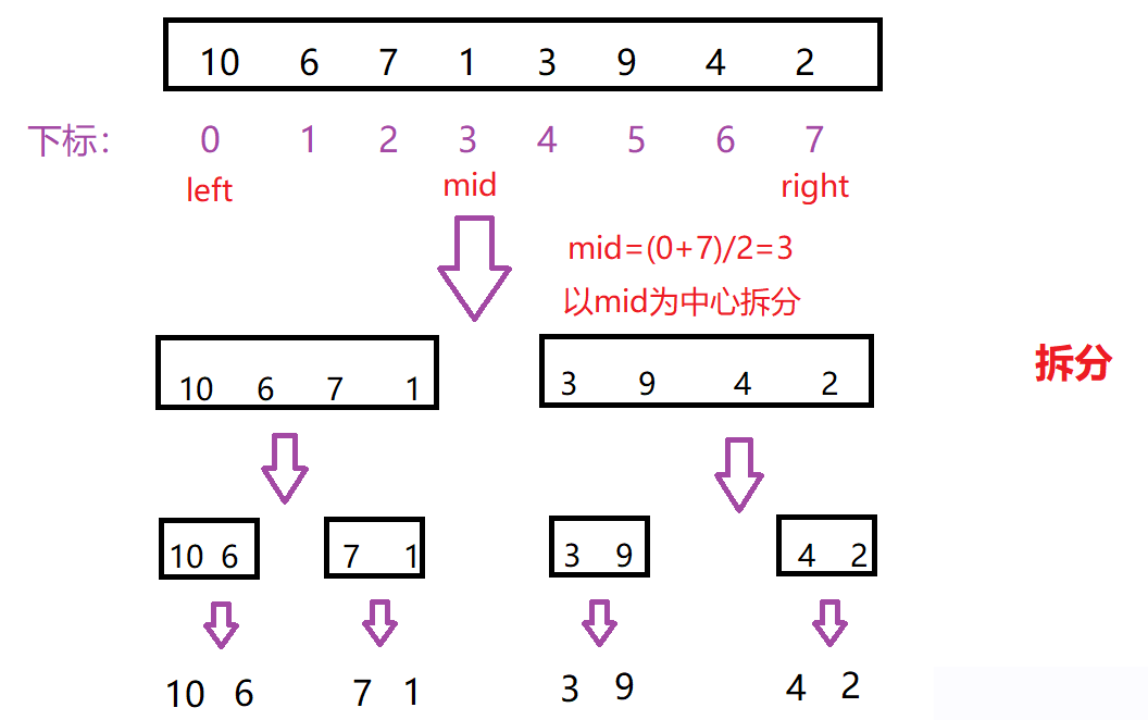- 1、(拆分)将一段数组分为左序列和右序列,让他们两个分别有序,再将左序列细分为左序列和右序列,如此重复该步骤,直到细分到区间不存在或者只有一个数字为止