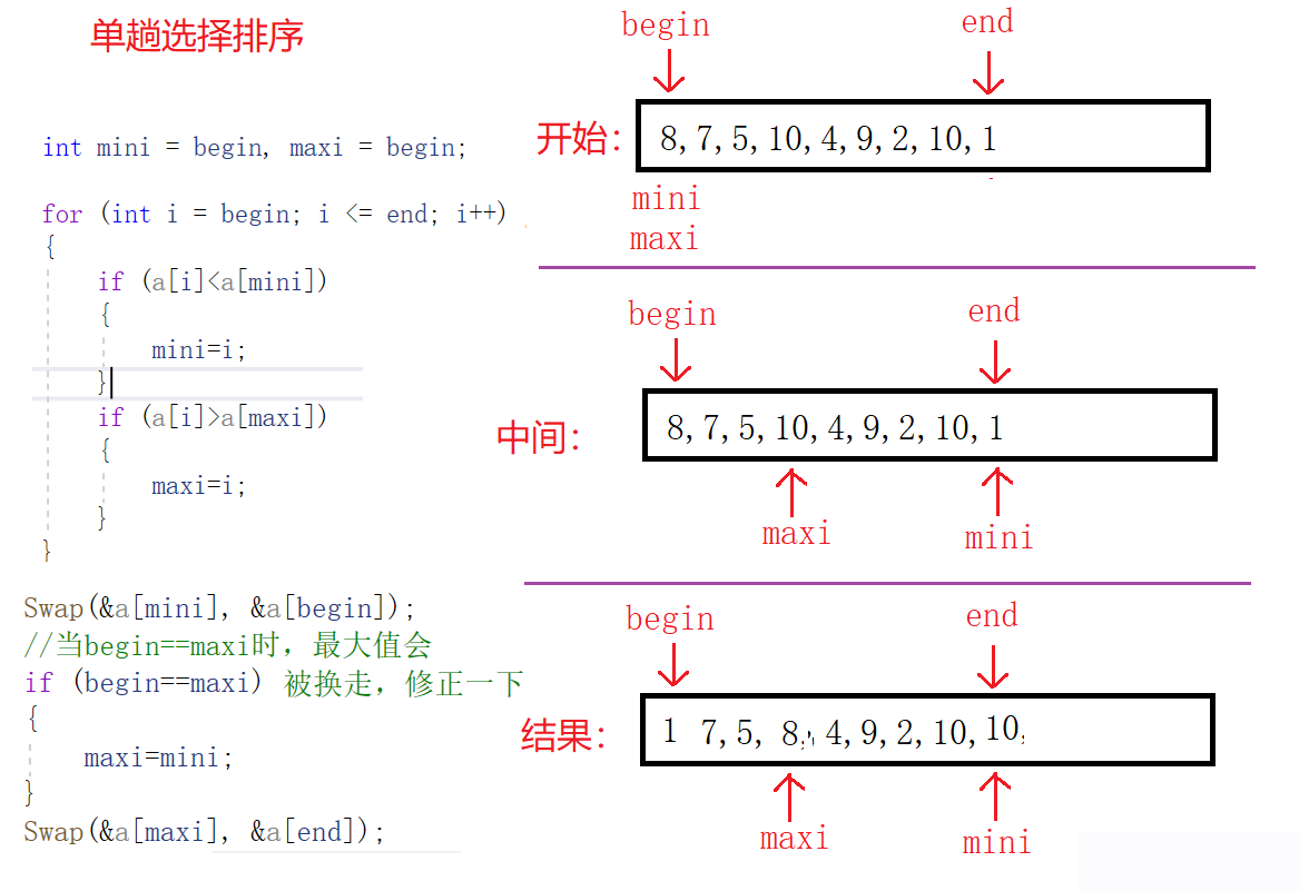 ps:其中的begin,end保存记录左右的下标,mini,maxi记录保存最小值和最大值得下标