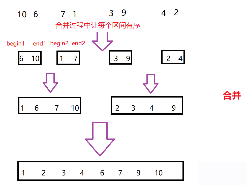 由于我们操纵的是数组的下标,所以我们需要借助数组,来帮我们存储上面递归得到的数组下标,和递归的区别就是,递归要将区间一直细分,要将左区间一直递归划分完了,再递归划分右区间,而借助数组的非递归是一次性就将数据处理完毕,并且每次都将下标拷贝回原数组