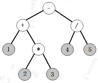所示为1+2*3-4/5 代数表达式对应的二叉树,然后由对应二叉树计算该表达式的值