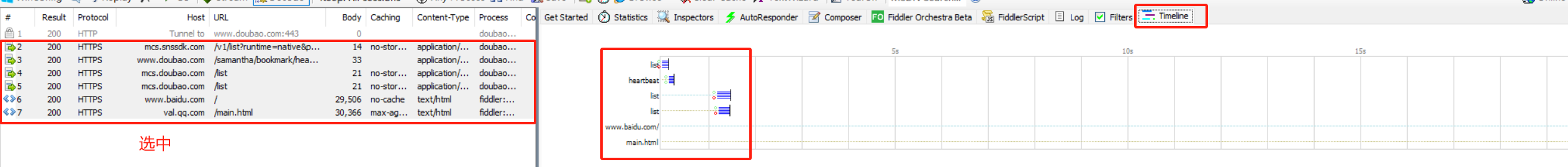 你可以选则一个或多个请求,然后再Timeline中便会显示指定内容从服务器返回所消耗的时间