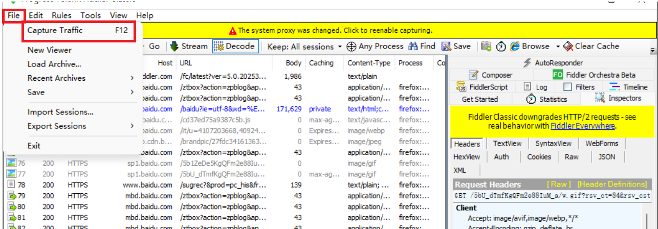 所以想要“看到”报文就需要通过我们的代理主机,而部署Fiddler的主机就作为代理主机让我们来查看客户端的出入流量,这里我们的代理主机和客户端实际上是同一个,即Fiddler和客户端在同一台主机上部署。如果你愿意,你也可以尝试一下使用Fiddler来抓取来自手机端的报文,这个时候Fiddler部署在你的PC端上,客户端就相当于部署在你的手机端上,这个时候代理主机(Fiddler)和客户端主机(你的手机)就不是同一台主机了。