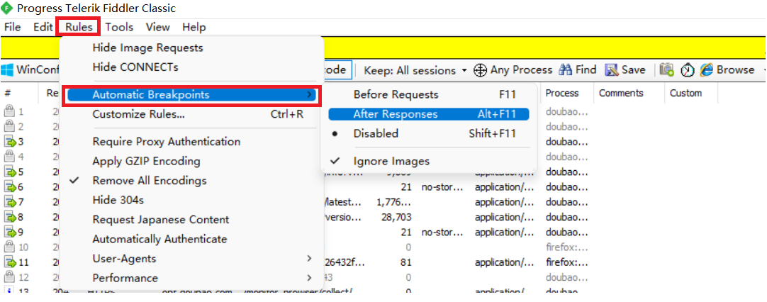 要想使用断点功能,我们需要先设置断点:Rulues-》Automatic Breakpoints-》设置断点类型。