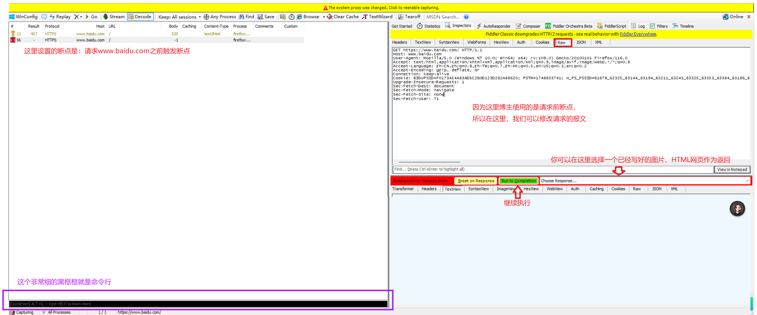 我猜你可能会问:”断点的功能不是都可以交由自动响应完成吗?为什么还需要断点这个功能呢?“。这是因为断点和自动响应处理的场景不同,断点就有点像我们写代码调试的时候使用的,他是一个临时的解决方案,是用来解决突发情况的,但是自动响应则是为了验明程序是否可以完成需求。断点常常是线上环境状况突发时,用来快速定位问题的,自动响应则是用来测试接口或功能是否正常的。