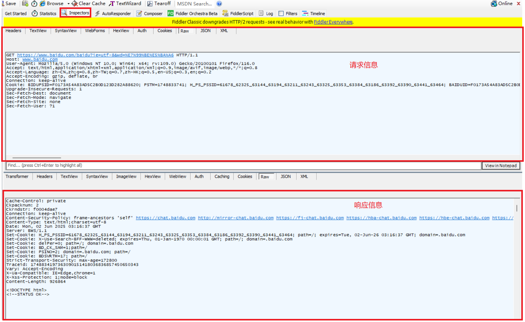 Inspectors是用于查看会话的内容的,上半部分是请求的内容,下半部分是相应的内容,提供了headers、textview、hexview、Raw等多种方式查看单条HTTP请求的请求报文信息