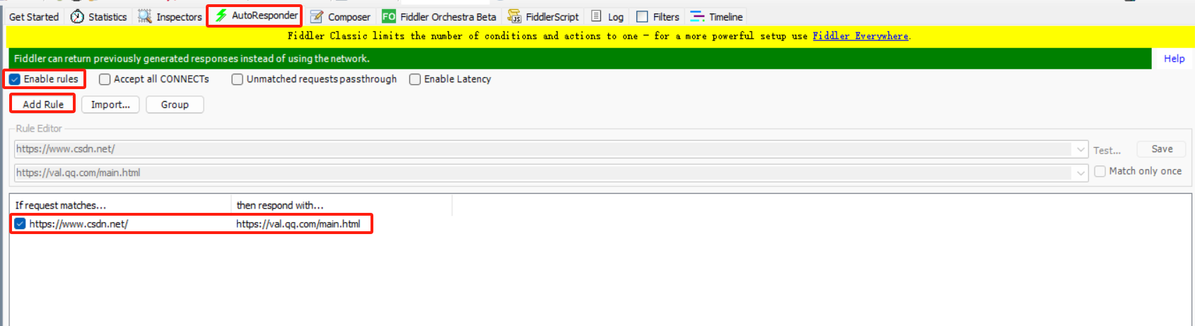 AutoResponder可用于拦截某一请求,即按自己添加的指定规则重定向到本地的资源或Fiddler资源,从而代替服务器的响应。这种操作本质上就是代理机并没有将我们的请求发送给服务端并且返回一个代理机中预设的值。不知道各位小时候经历过想要下载A软件,但是点击下载后,下载的确实B软件。因为我们的流量最终都会转发到三大运营商(联通、电信、移动),所以他们就可以将我们的请求做更改,本来请求A,硬生生让服务商改成请求B。我们使用Fiddler实际上也可以完成这个工作。