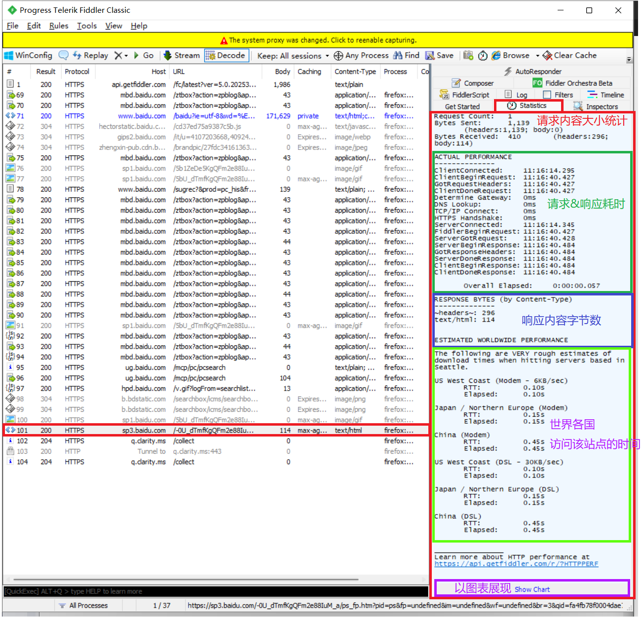 统计工具中有关于HTTP请求的性能信息以及数据的分析。如发送/接受的字节数、发送/接收时间、阻络统计世界各地访问该服务器的时间等。