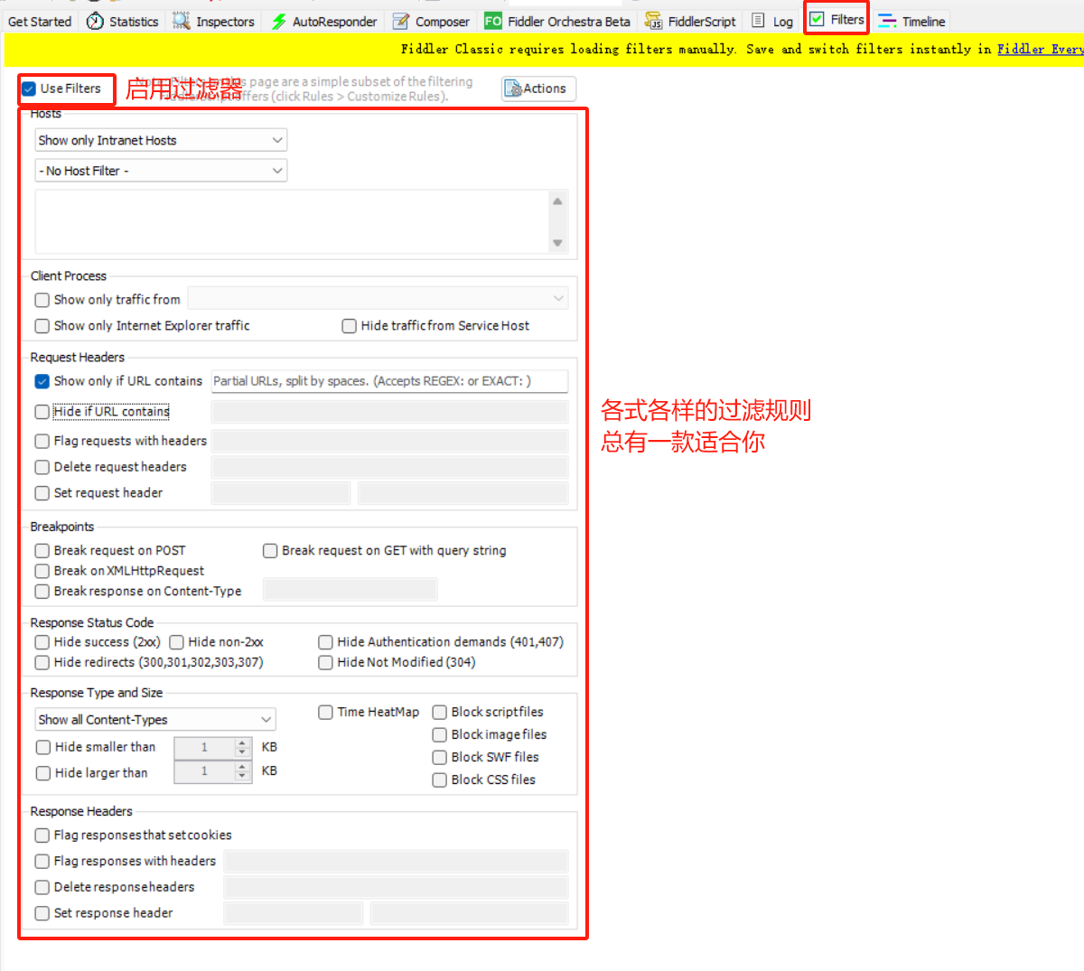 在不进行过滤的情况下,Fiddler会捕捉所有的请求和响应,这通常不是我们所希望的,我们希望它能够按照一定的规则获取指定服务端通信的请求与响应。