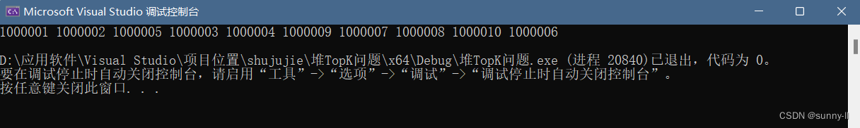#include <stdio.h> #include <stdlib.h> #include <assert.h> #include <stdbool.h> typedef int HPDatatype; void Swap(HPDatatype* x, HPDatatype* y) { HPDatatype temp = 0; temp = *x; *x = *y; *y = temp; } void AdjustDown(HPDatatype* a,int n,int parent) { // 左孩子 int child = parent * 2 + 1; // 防止越界 while (child < n) { //小堆 if (child + 1 < n && a[child] > a[child + 1]) { child++; } // 开始向下调整 if (a[child] < a[parent]) { Swap(&a[child], &a[parent]); parent = child; child = parent * 2 + 1; } else { break; } } } void TopK(HPDatatype* a, int n, int k) { HPDatatype* kminHeap = (HPDatatype*)malloc(sizeof(HPDatatype) * k); assert(kminHeap); // 1. 建堆----用a中前k个元素建堆 for (int i = 0; i < k; i++) { kminHeap[i] = a[i]; } // 建小堆 for (int j = ((n - 1) - 1) / 2; j >= 0; j--) { // 从倒数第一个非叶子节点开始 AdjustDown(kminHeap, k, j); } // 2. 将剩余n-k个元素依次与堆顶的元素交换,比堆顶大,交换 for (int i = k; i < n; i++) { if (a[i] > kminHeap[0]) { kminHeap[0] = a[i];//如果比堆顶大,就替换 AdjustDown(kminHeap, k, 0);//向下调整确保为堆 } } for (int j = 0; j < k; j++) { printf("%d ", kminHeap[j]); } printf("\n"); free(kminHeap); } int main() { int n = 10000; int* a = (int*)malloc(sizeof(int) * n); srand(time(0)); for (int i = 0; i < n; ++i) { a[i] = rand() % 1000000; //产生一个随机数,数值均小于100万 } a[5] = 1000000 + 1; a[1231] = 1000000 + 2; a[531] = 1000000 + 3; a[5121] = 1000000 + 4; a[115] = 1000000 + 5; a[2335] = 1000000 + 6; a[9999] = 1000000 + 7; a[76] = 1000000 + 8; a[423] = 1000000 + 9; a[3144] = 1000000 + 10; TopK(a, n, 10); return 0; }