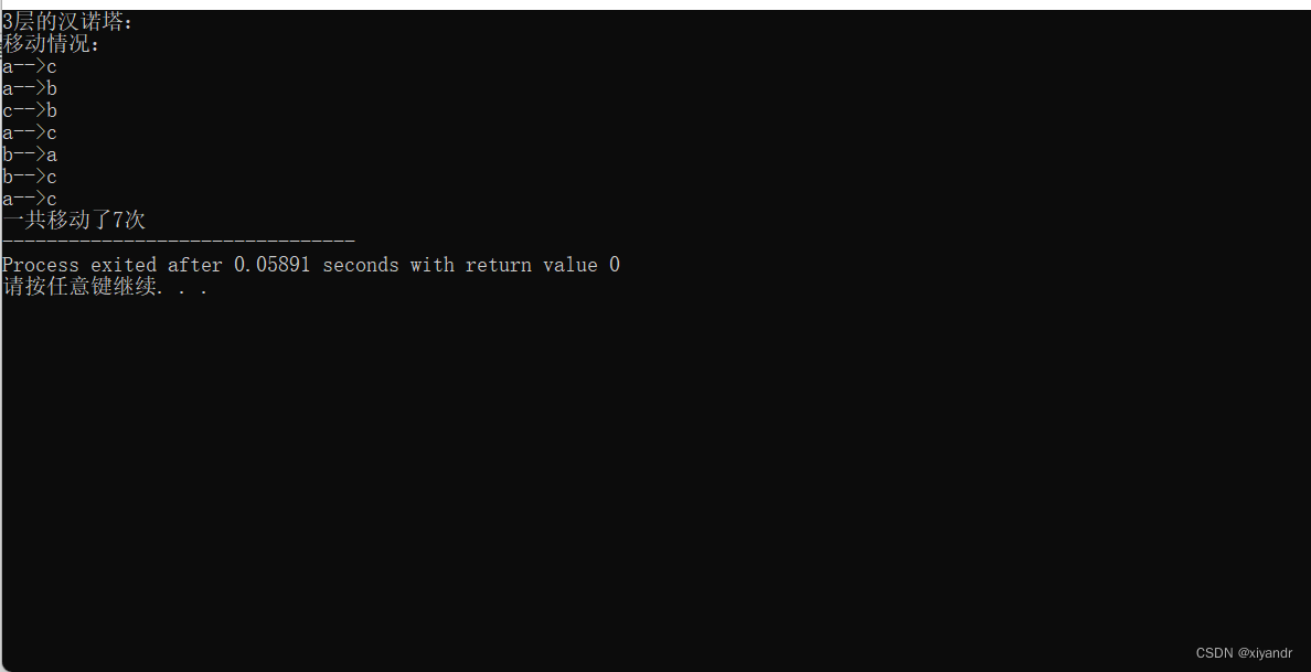 经典的递归问题:汉诺塔上代码:#include <stdio.h>#include <stdlib.h>int time=0;void move(int n,char start,char transfer,char objective){time++;if (n==1){printf("%c-->%c\n",start,objective);}else{move(n