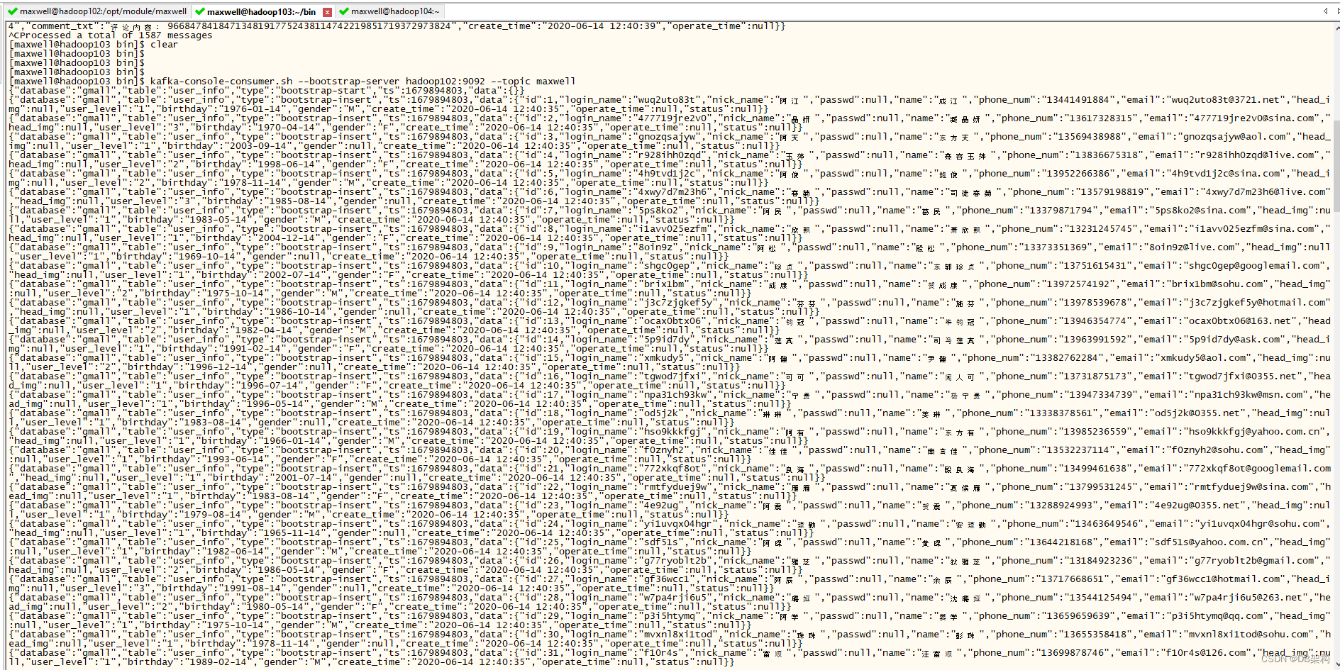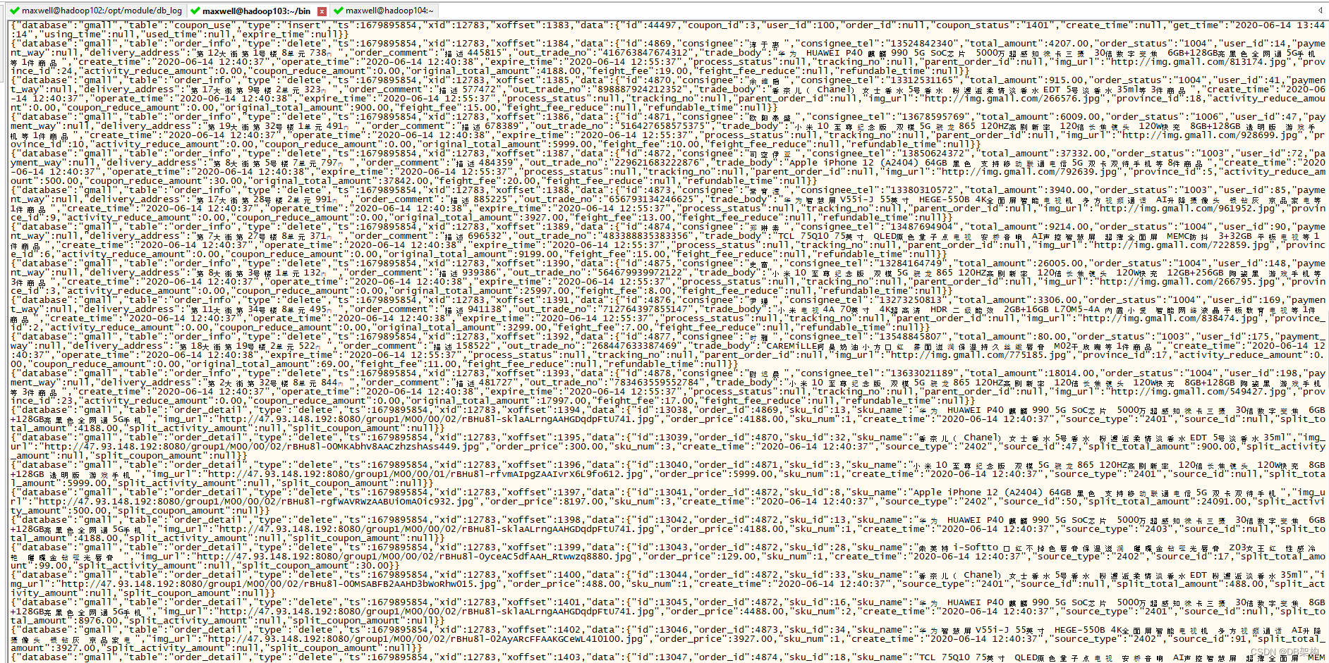 [maxwell@hadoop103 kafka]$ bin/kafka-console-consumer.sh --bootstrap-server hadoop102:9092 --topic topic_db