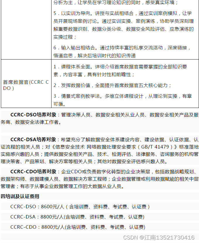 认证简介 CCRC-DSO数据安全官培训项目,依据《数据安全法》设立,主要面向数据开发技术人员与数据安全领域的中高级管理人员及专业技术人员,旨在培养能在战略规划、管理运营等方面具备全面视角的数据安全管理人才。