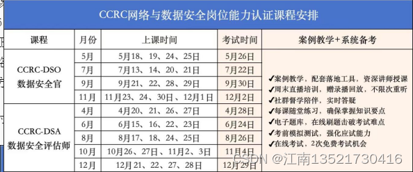而CCRC-DSA数据安全评估师则侧重于为满足《数据安全法》相关要求,专门针对进行数据安全检测评估与提供咨询服务的专业评估人员所设计,目的在于强化风险评估和合规性检测等关键领域的专业能力。