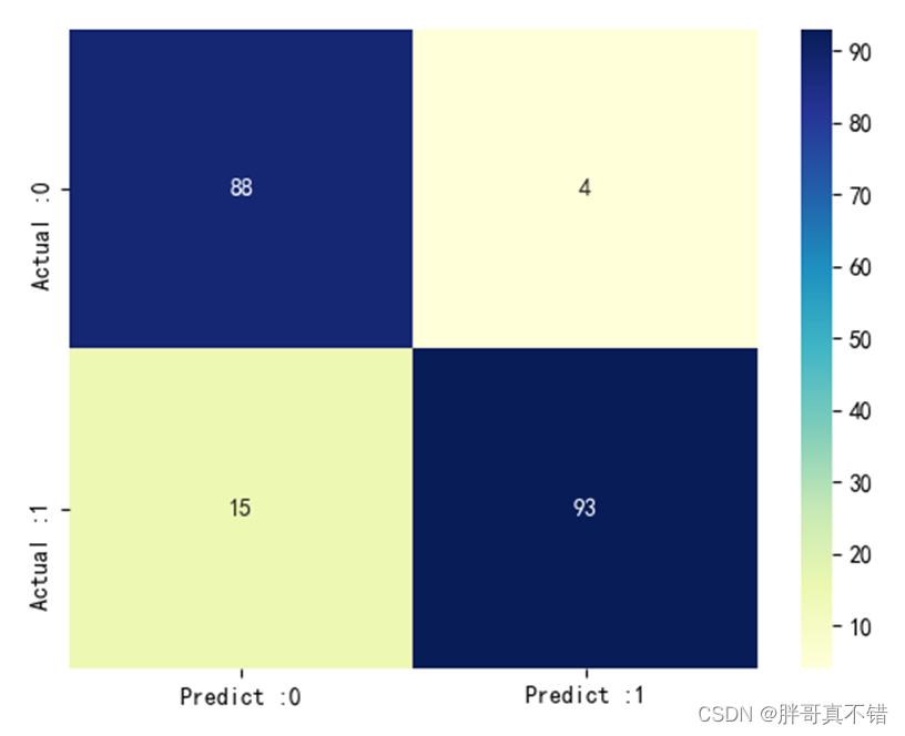 从上图可以看出,实际为0预测不为0的 有4个样本,实际为1预测不为1的 有15个样本,模型效果较好。
