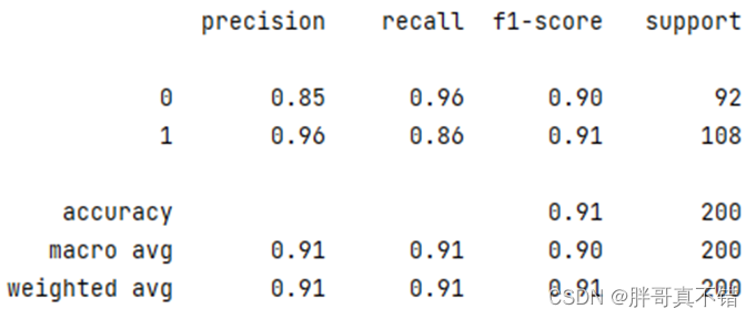 从上图可以看出,分类为0的F1分值为0.90;分类为1的F1分值为0.91。