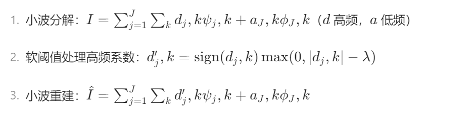 原理:通过小波变换将图像分解为低频近似和高频细节,对高频系数阈值处理后重建。