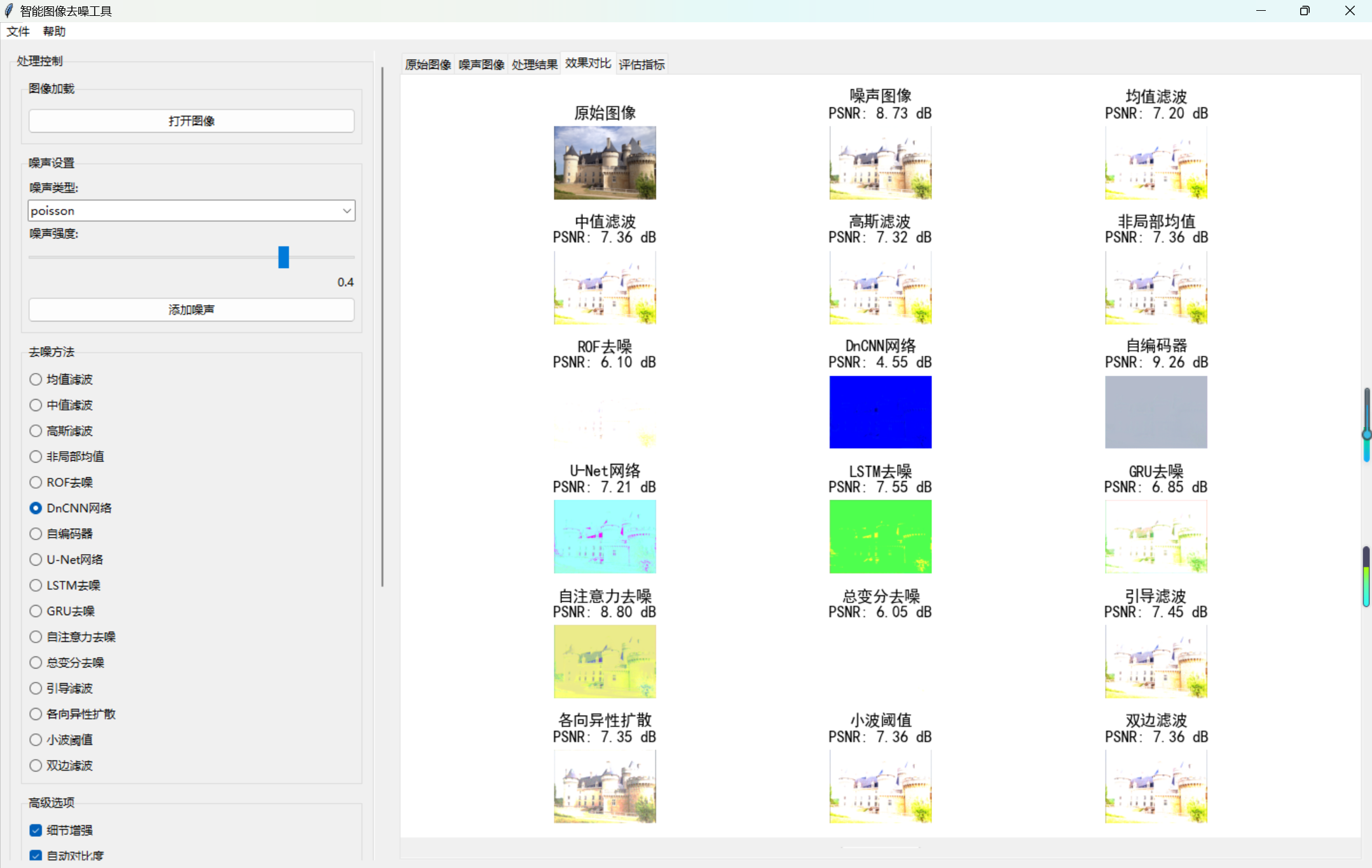 - 16 种去噪算法(传统方法 + 深度学习模型)