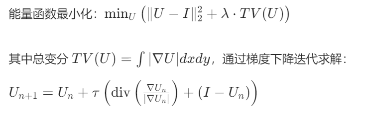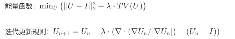 原理:通过最小化图像总变分能量抑制噪声,保留边缘。