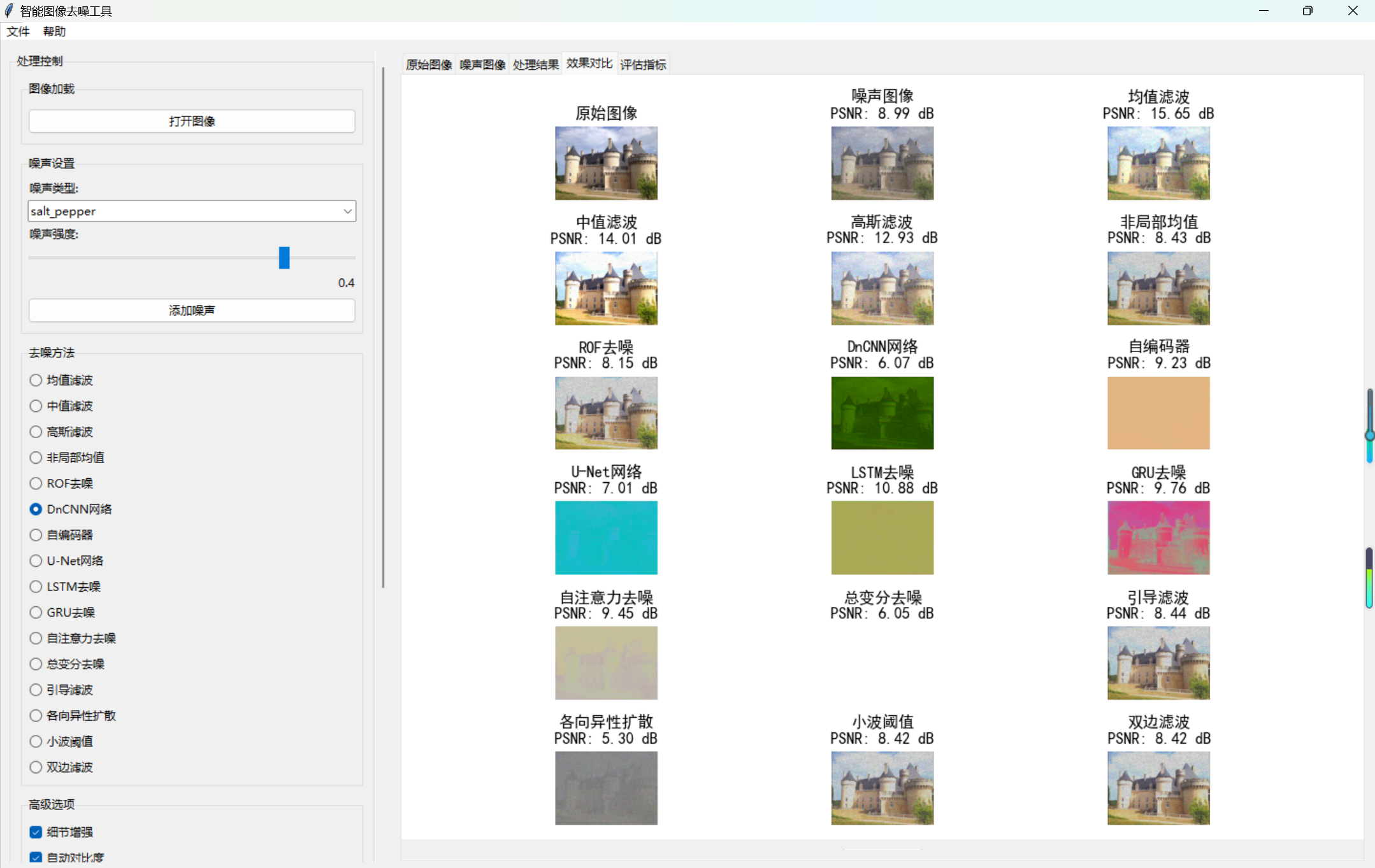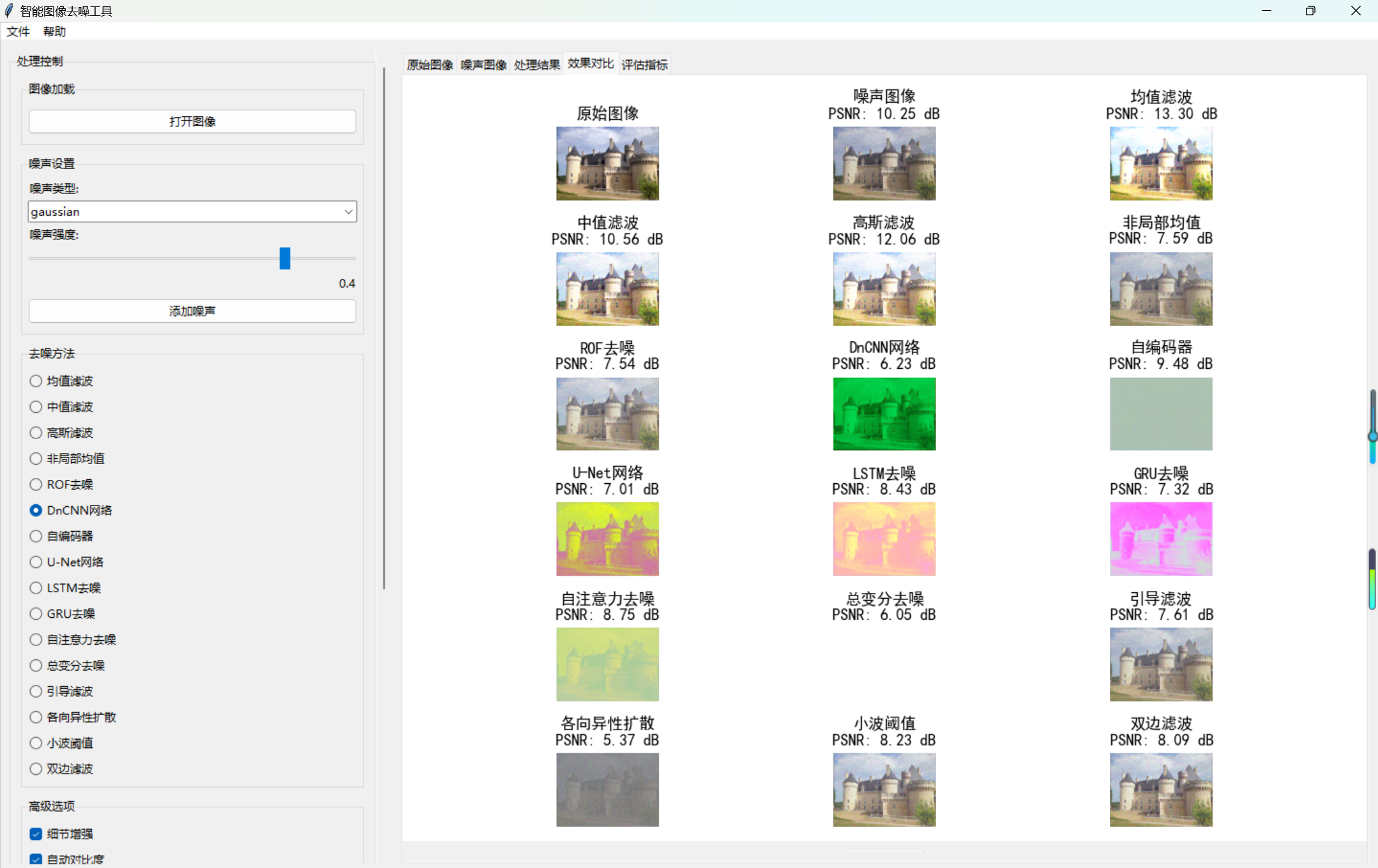 本文实现一个集成多种传统与深度学习去噪算法的图像去噪工具,支持噪声添加、自适应参数调整、多方法对比及量化评估。核心功能包括: