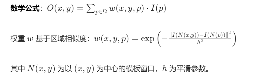 原理:通过寻找图像中相似区域(而非局部邻域)进行加权平均,保留细节的同时去噪。