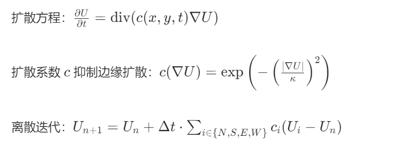 原理:根据图像梯度调整扩散强度(边缘处扩散弱,平坦区扩散强)。