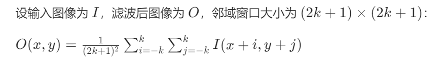原理:用像素邻域内所有像素的平均值替换中心像素,平滑噪声。