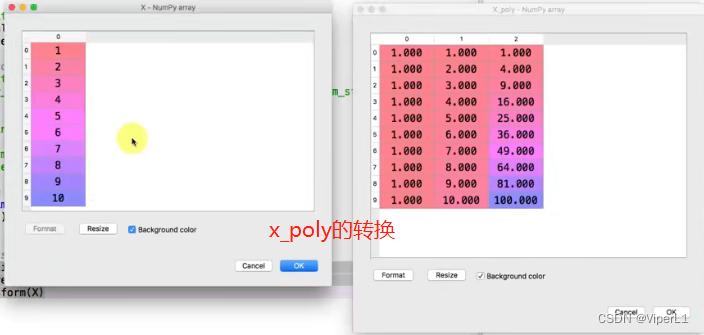 poly_reg = PolnomialFeatures(degeree=2) --用于将自变量替换为其更高阶的矩阵(示例为2次)