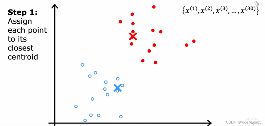 随机分配两个质心(这里假设我们需要的是划分出两个集群,然后接下来是对每个数据点进行归类,将其分配给某个群(严格来说是和距离自己最近的质心打上同样的标记)