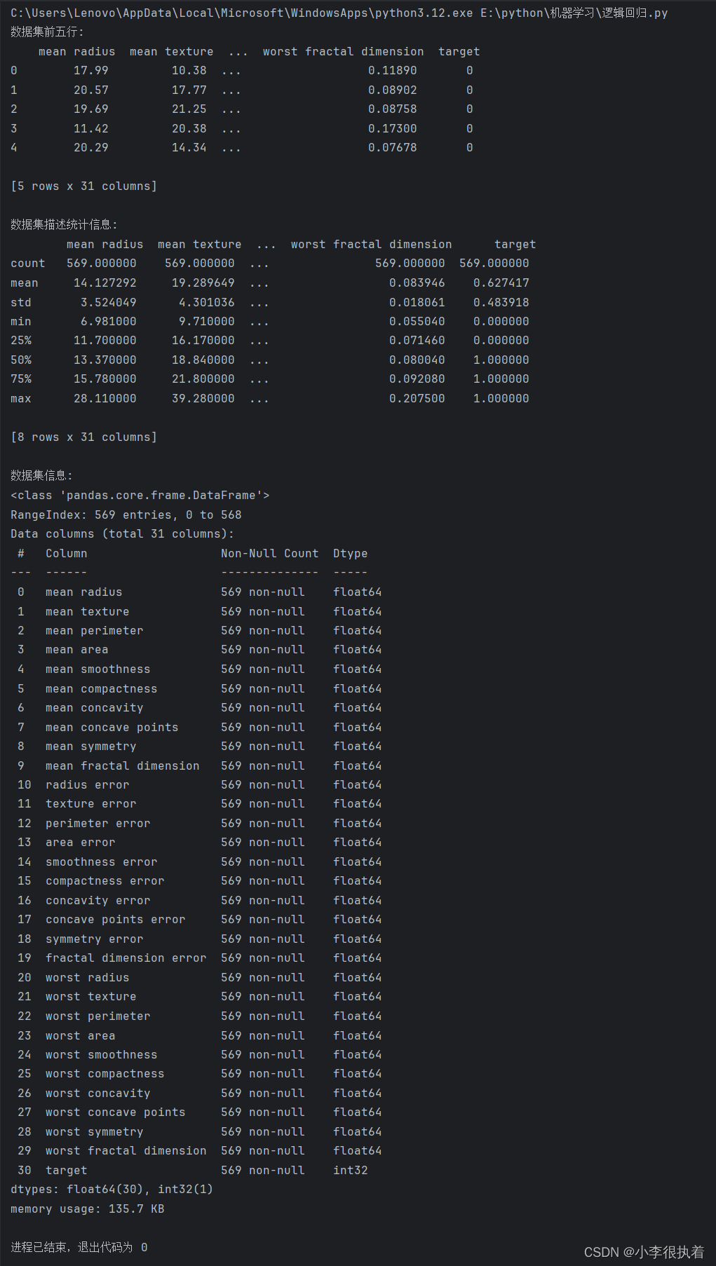 在本案例中,我们将使用经典的乳腺癌数据集(Breast Cancer Dataset)进行乳腺癌检测预测。该数据集包含569个样本,每个样本有30个特征,并标记为良性(0)或恶性(1)。我们的目标是使用这些特征训练一个逻辑回归模型,预测新的样本是良性还是恶性。