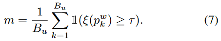 使用未标记集的特定比率作为模型状态的指标。在每次迭代时跟踪特定的比率,并以指数移动平均(EMA)方式全局累积。形式上,单个小批量中的特定比例由下式给出: