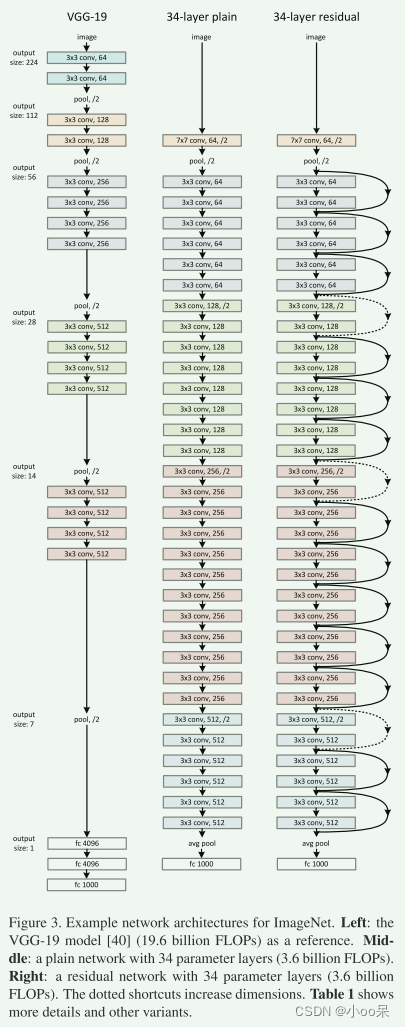 上图是残差网络论文中的配图,左边是VGG-19;中间是普通网络,有34个参数层;右边是具有34个参数层的残差网络。