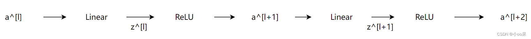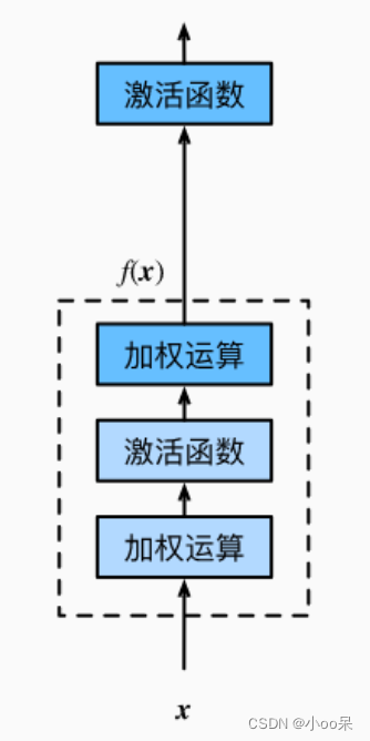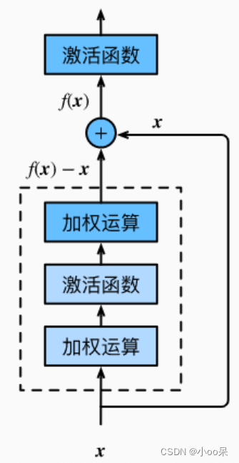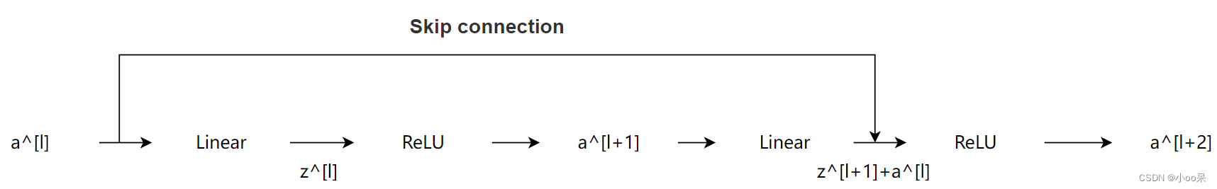 【注】跳跃连接的起点终点是很有讲究的,是将输入x加到第二层线性函数之后,ReLU非线性激活函数之前。