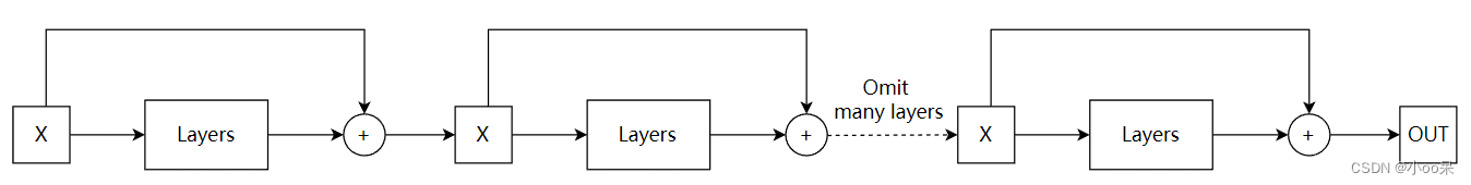 上面的残差块里详细的表示展示了计算函数,如果我们不关心这些中间计算过程,那么一个残差块还可以表示成下面这样: