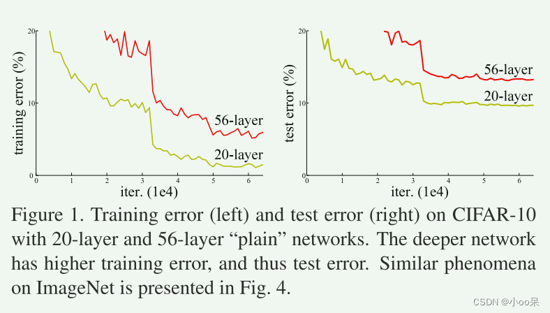 如图1,使用20层和56层“普通”网络的CIFAR-10上的训练误差(左)和测试误差(右)。更深的网络具有更高的训练误差,从而具有更高的测试误差。