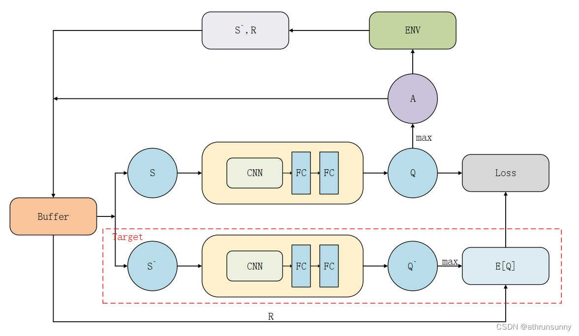 (2)对于经验回放,其会构建一个回放缓冲区,用来保存数据,每一个数据的内容包括:状态 st、采取的动作 at、得到的奖励 rt、下一个状态 st+1。我们使用 π 与环境交互多次,把收集到的数据都放到回放缓冲区中。防止占用过多的内存,当回放缓冲区“装满”后,就会自动删去最早进入缓冲区的数据。在训练时,对于每一轮迭代都有相对应的批量(采样得到),然后用这个批量中的数据去更新 Q 函数。即 Q 函数在采样和训练的时候会用到过去的经验数据,也可以消除样本之间的相关性。