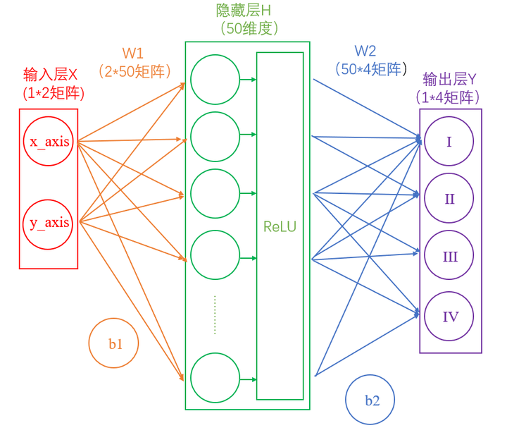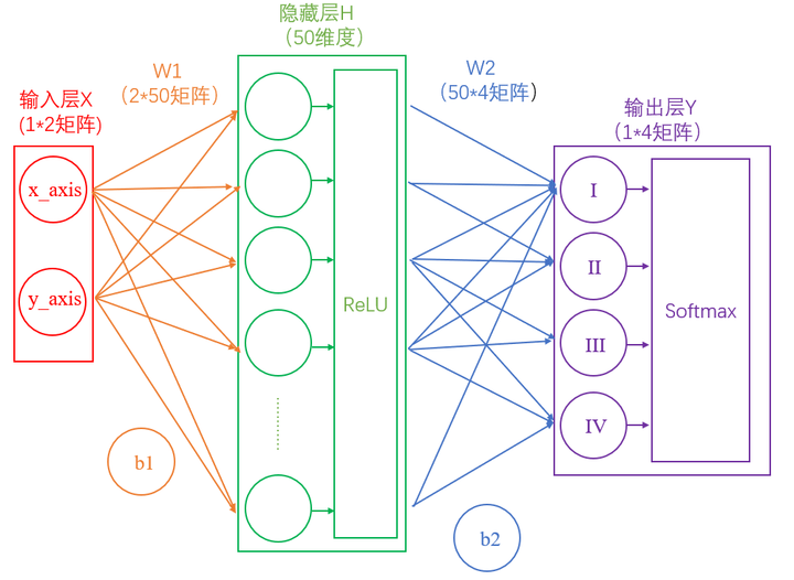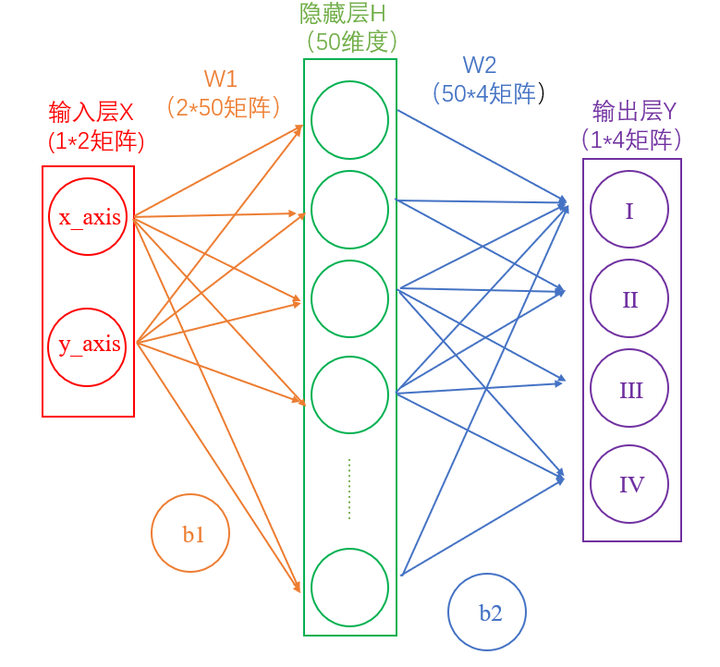 这里我们构建一个两层神经网络,理论上两层神经网络已经可以拟合任意函数。这个神经网络的结构如下图: