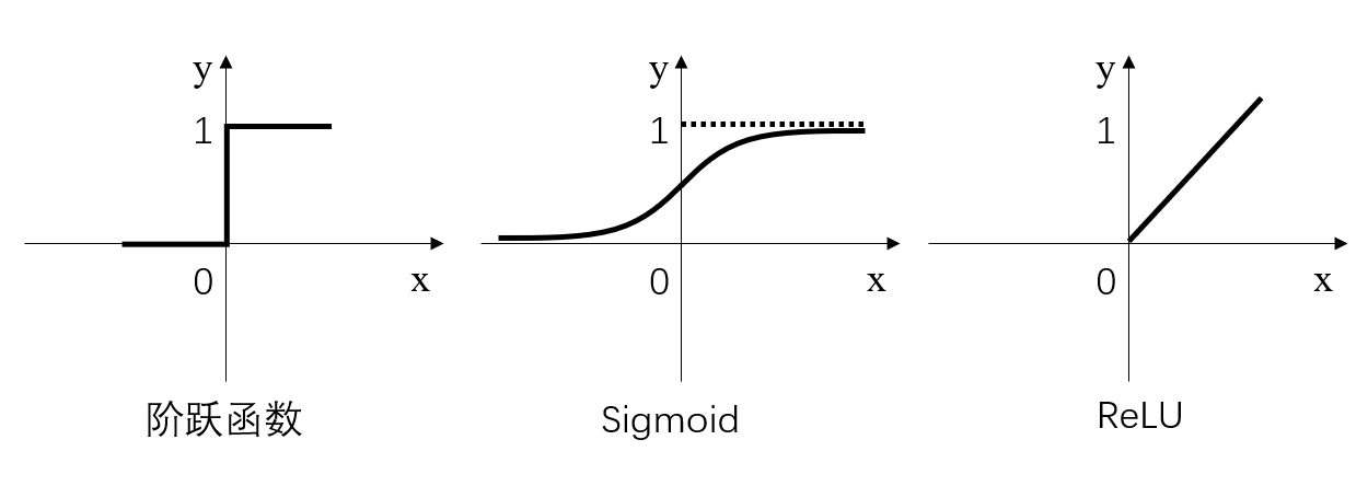 简而言之,激活层是为矩阵运算的结果添加非线性的。常用的激活函数有三种,分别是阶跃函数、Sigmoid和ReLU。不要被奇怪的函数名吓到,其实它们的形式都很简单,如下图:
