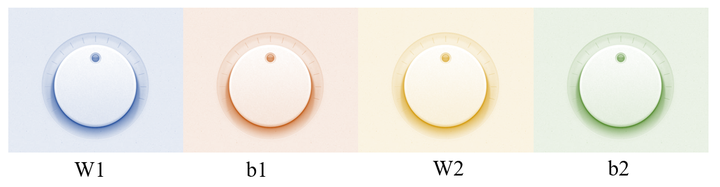 我们在机器中操纵着四个旋钮,分别叫做W1,b1,W2,b2。当我们旋转其中的某个旋钮时,球形机器会发生移动,但是旋转旋钮大小和机器运动方向之间的对应关系是不知道的。而我们的目的就是走到沙漠的最低点。