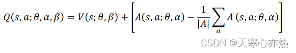 然而, 这并不是唯一的, 因为可以用 𝑉(𝑠) 来预测一个量 𝛿, 而用 𝐴(𝑠,𝑎) 来预测同样的量 𝛿 ,这使得神经网络预测无法识别。为了避免这个问题,竞争网络论文的作者建议采用以下方法将 𝑉(𝑠) 和𝐴(𝑠,𝑎) 结合起来: