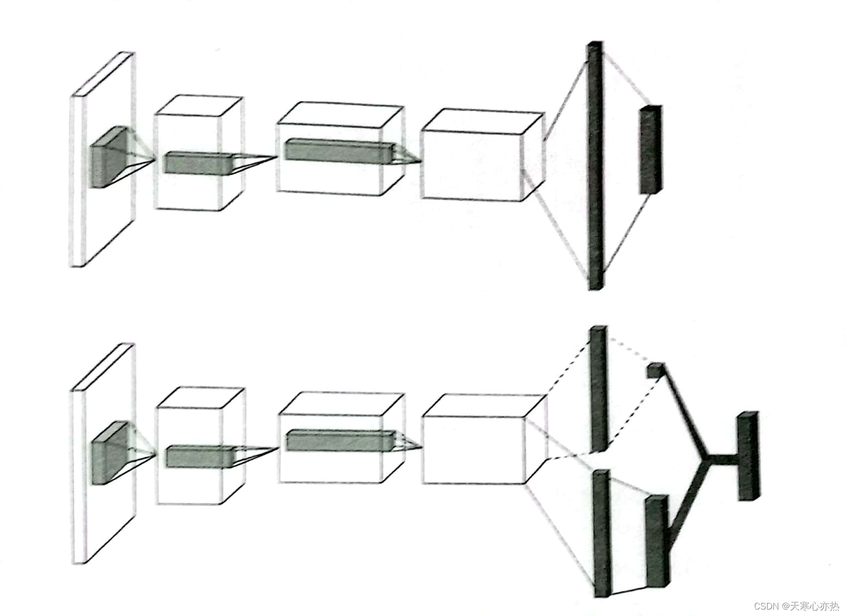 标准DQN网络(上)和竞争网络结构(下)