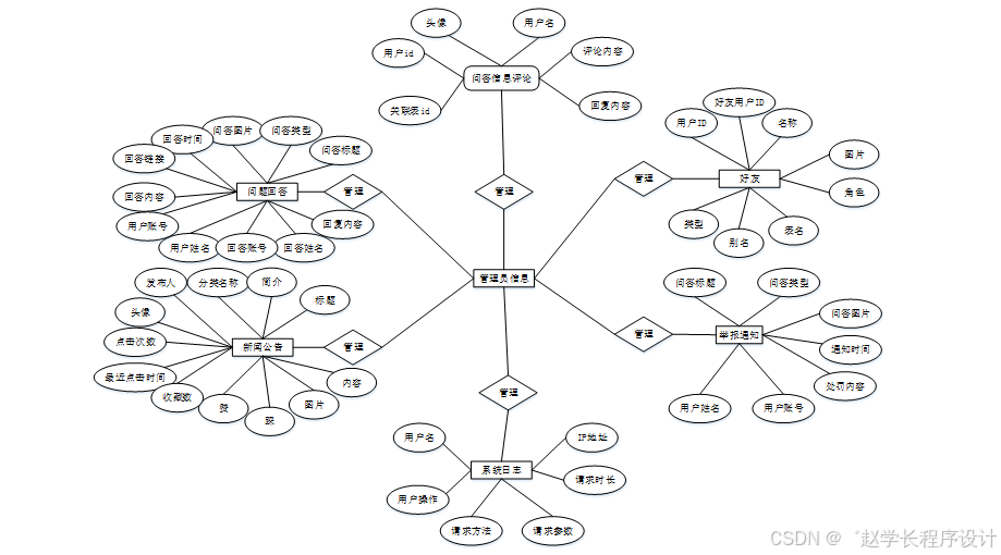 ER图是由实体及其关系构成的图,通过E/R图可以清楚地描述系统涉及到的实体之间的相互关系。在系统中对一些主要的几个关键实体如图:以下将“问题回答、问答信息评论、好友、举报通知、系统日志、新闻公告”等作为实体,它们的局部E-R图,如图4-2所示: