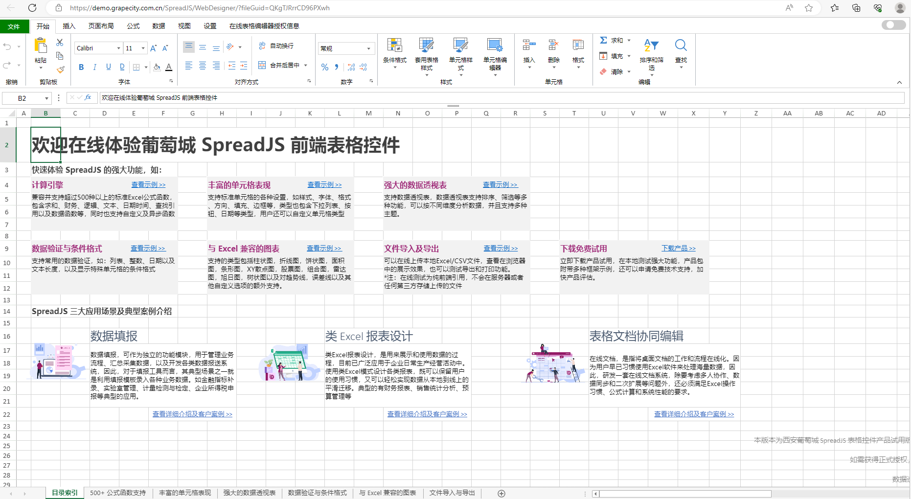 SpreadJS 是葡萄城公司的商业Excel表格控件,有趣的是我发现在 V2EX 的 LuckySheet 下方评论区中,LuckySheet 的作者也说 SpreadJS 是行业标杆。它支持导入包括公式、图表、样式、条件格式在内的绝大部分 Excel 特性(不支持宏)。并且最惊喜的是,它的操作界面是一个完整的 Excel 界面,完全纯 JS 开发的,用 json 进行模板和数据交互。同时 SpreadJS 也有对应的售后支持团队,技术问题可以工作日期间随时电话、论坛交流,相关的资料包括视频、文档、示例、API 手册也都非常丰富,甚至还可以请他们的技术顾问来公司培训。对于像我们这种工期短、开发任务比较繁重的项目组,确实能节约大量的精力,降低了风险。