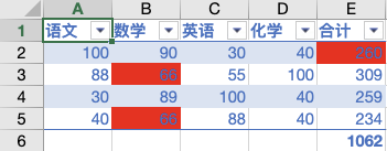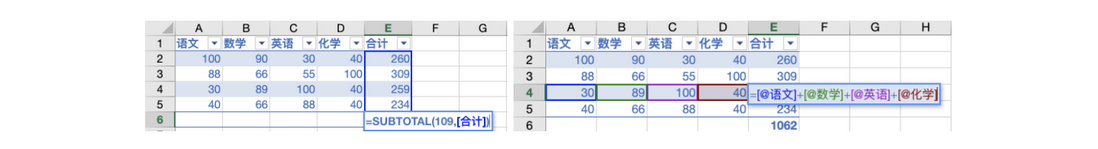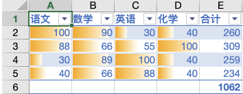 tableDataBind() { // 数据源,可以从后台请求拿到 var dataSource = { // 注意这里加了一层bindPath,用于映射表格的绑定路径 bindPath_table: [{ c1: 100, c2: 90, c3: 30, c4: 40 }, { c1: 88, c2: 66, c3: 55, c4:100 }, { c1: 30, c2: 89, c3: 100, c4: 40 },{ c1: 40, c2: 66, c3: 88, c4: 40 }] }; // 表格绑定和单元格绑定数据源,需要用SpreadJS的CellBindingSource包装一下 var spreadNS = GC.Spread.Sheets; var dataSource1 = new spreadNS.Bindings.CellBindingSource(dataSource); var table2 = this.activeSheet.tables.add("tableName", 0, 0, 1, 5, spreadNS.Tables.TableThemes.light6); table2.showFooter(true); table2.autoGenerateColumns(false); var c1 = new spreadNS.Tables.TableColumn(1); c1.name("语文"); c1.dataField("c1"); var c2 = new spreadNS.Tables.TableColumn(2); c2.name("数学"); c2.dataField("c2"); var c3 = new spreadNS.Tables.TableColumn(3); c3.name("英语"); c3.dataField("c3"); var c4 = new spreadNS.Tables.TableColumn(4); c4.name("化学"); c4.dataField("c4"); var c5 = new spreadNS.Tables.TableColumn(5); c5.name("合计"); table2.bindColumns([c1, c2, c3, c4, c5]); table2.bindingPath("bindPath_table"); // 设置公式 table2.setColumnDataFormula(4, "=[@语文]+[@数学]+[@英语]+[@化学]"); table2.setColumnFormula(4, "=SUBTOTAL(109,[合计])"); // 设置允许单元格的内容超出单元格,与绑定无关 this.activeSheet.options.allowCellOverflow = true; // 绑定dataSource this.activeSheet.setDataSource(dataSource1); this.spread.resumePaint(); }