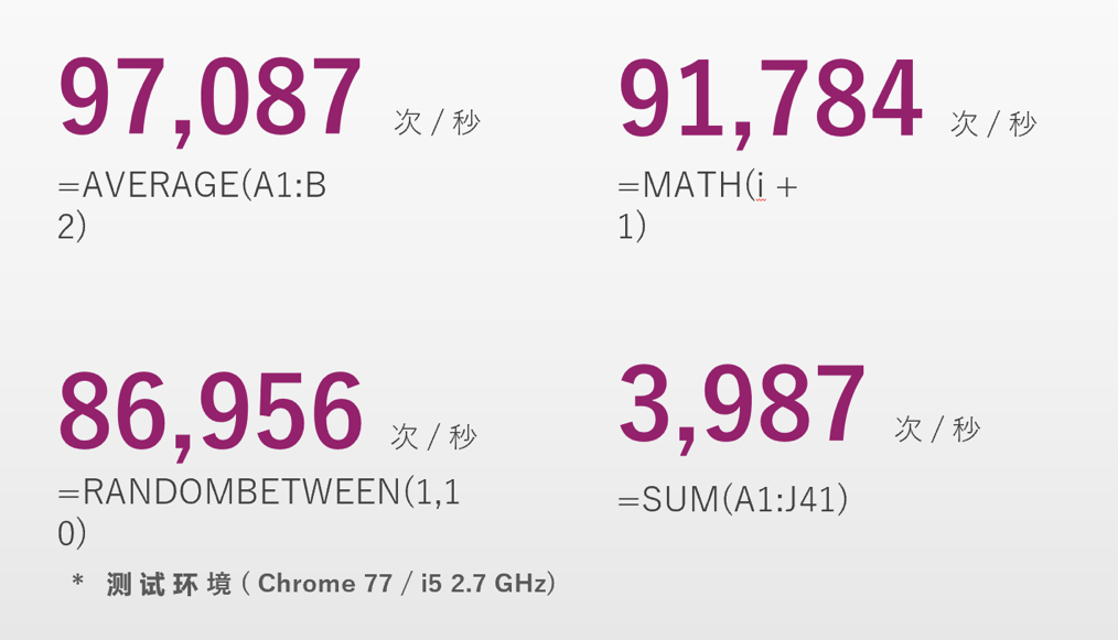 据我们测试,以上计算性能接近原生JS的计算性能,SpreadJS 在这方面的优化已经十分接近物理极限了。目前在我们的应用场景中,这个计算性能已经足够使用,但不排除以后会出现海量的数据和公式的计算需求,而在这方面官方也给出了相关解决方案,参考这里。