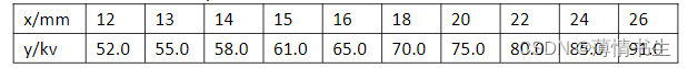 用x光机检查镁合金铸件内部缺陷时,为了获得最佳的灵敏度,透视电压y应随透视件的厚度x而改变,经实验获得下表所示一组数据,假设透视件的厚度x无误差,试求透视电压y随厚度x变化的经验公式。
