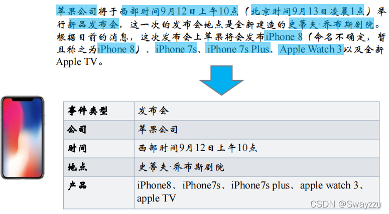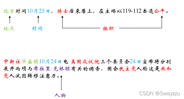 如下,句子中类似于地点信息,时间信息,人物信息等等,只要是我们需要的重点信息,都可以认为是实体。